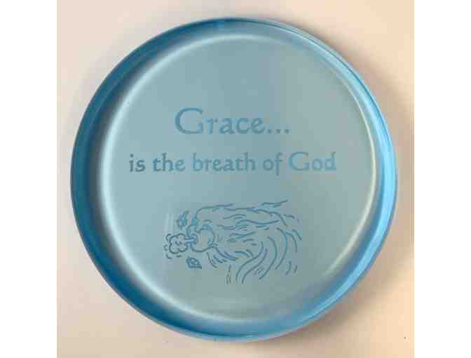 Circular Artwork featuring Etched Design in light blue lucite. Measures 6 inches in diameter. Stand included.