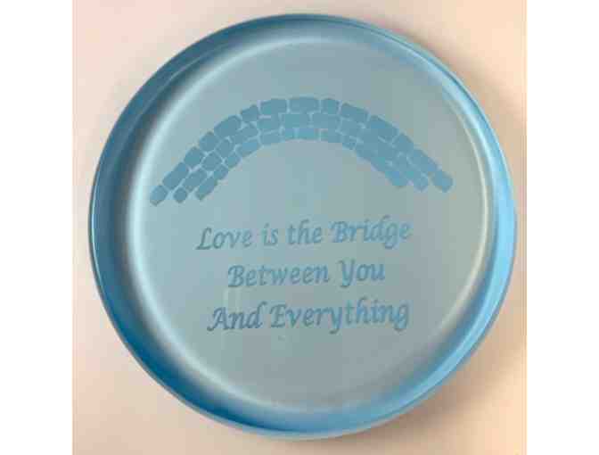 Circular Artwork featuring Etched Design in light blue lucite. Measures 6 inches in diameter. Stand included.