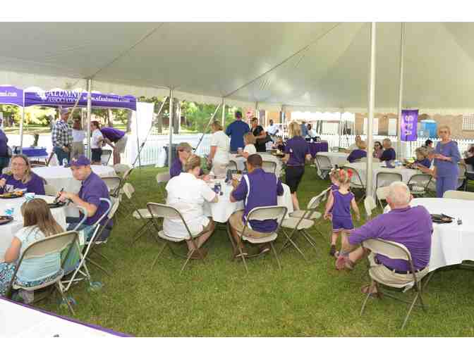 Package includes tailgate party setup including 20' x 30' tent, tables, and chairs. Pre-game meal for 30 including hamburgers and hot dogs with all the accompaniments, chips, cookies, tea and water, plates, forks, napkins, etc. Also included in the package are 30 ticket vouchers to any home football game of your choice (excluding Homecoming; TBD)! Location will be across from the SFA Alumni Corner tent next to the Early Childhood Lab.