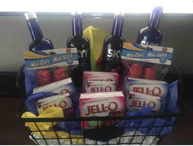 8B - Let's Take a Shot - a basket with all the items you need to make Jell-O shots and $50 in gift cards for all the rest!