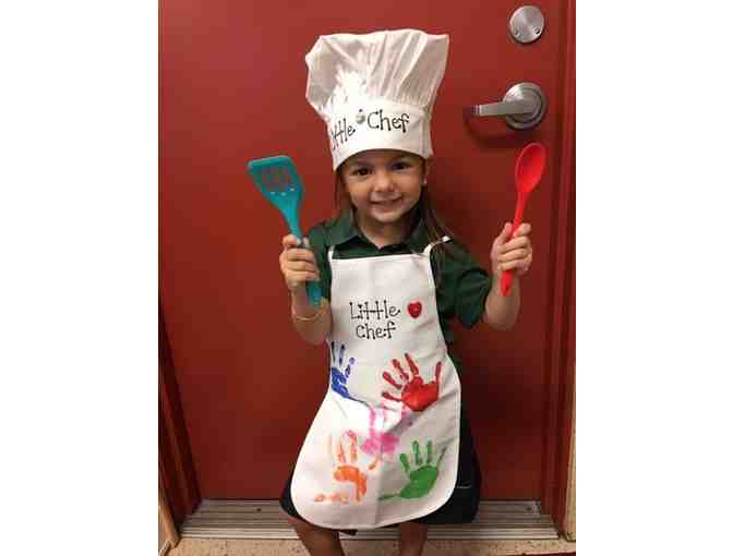 The children of PreK4B have decorated an adult-size apron (Big Chef) and a child-size apron (Little Chef) for the winner of the basket to use when baking with their child. Other items included in the Big Chef, Little Chef Basket are baking mixes, cookie sheet, muffin pan, mixing bowl, cookie cutter, rolling pin and more!