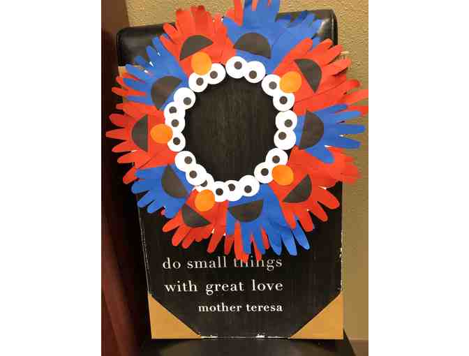 Sunny day! With a little help from Elmo and friends, children from the Early Learning Center (ELC) put their hands together to create their very own Sesame Street themed character wreath. Each handprint represents a child from the infant, 1-year old or 2-year old classrooms at GSCS in this colorful wreath that is sure to brighten any door!