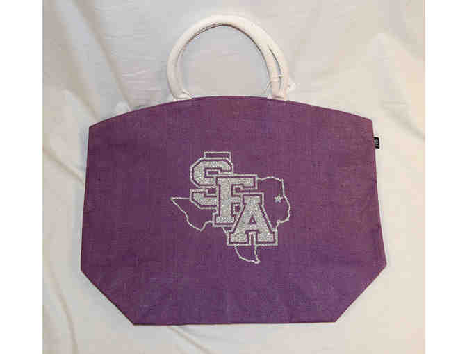 Going to the game? Headed to the beach? This oversized purple tote is fabulously versatile with its burlap-type fabric and sparkling silver SFA logo.