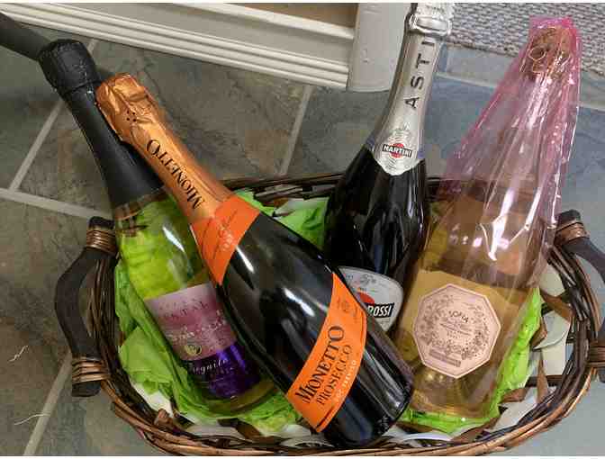 Enjoy this wine basket of four bottles of wine and spirits, including prosecco and white wine.