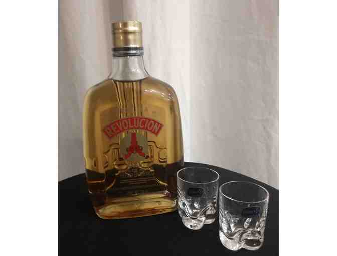 This package comes with 1-700 ml bottle of Revolucion Tequila and 2 crystal shot glasses.