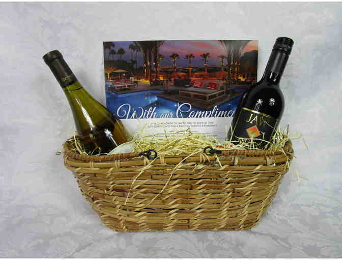 One-Night Stay in a Deluxe View Guestroom & Dinner for Two at the Phoenician Tavern (excludes alcohol & holidays). Reservations are based upon availability, not valid months of Feb, March or April and excludes holidays. Basket includes Jaw Cellars Cabernet Sauvignon & Chateau St Jean Chardonnay wines.