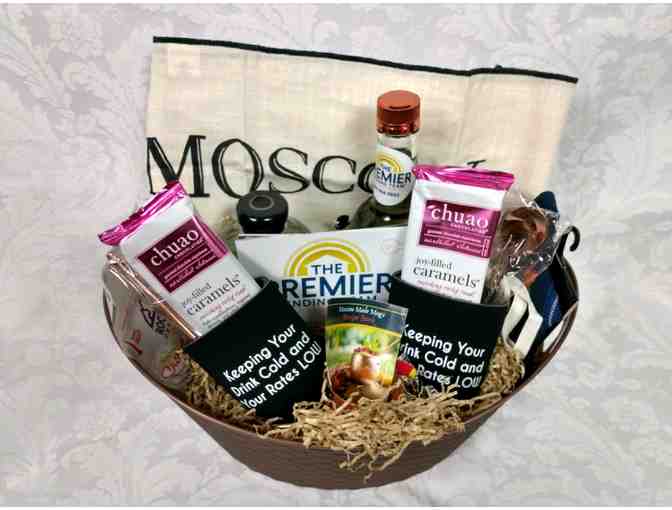 Tito's Vodka, Moscow Mule Mix, 2 copper mugs w/straws, stirrer spoon, Tea towel, Koozies, Socks, Chocolates, Snack Mix