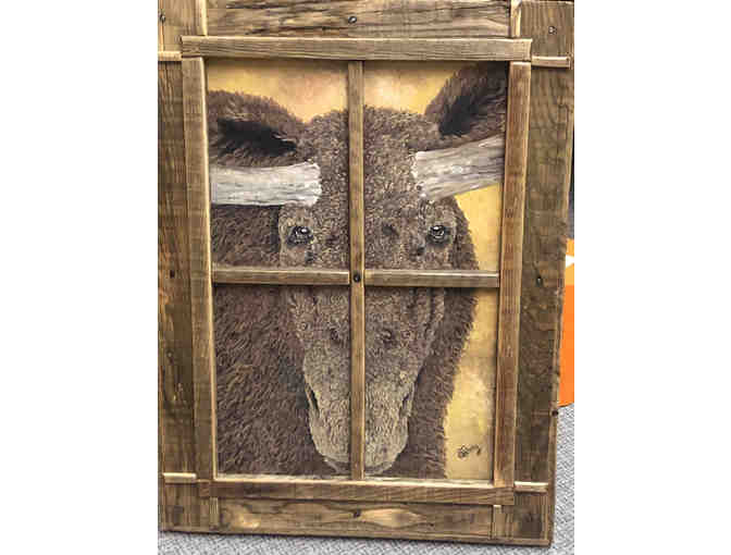 25.5" x 35" Moose painting in a rustic window.