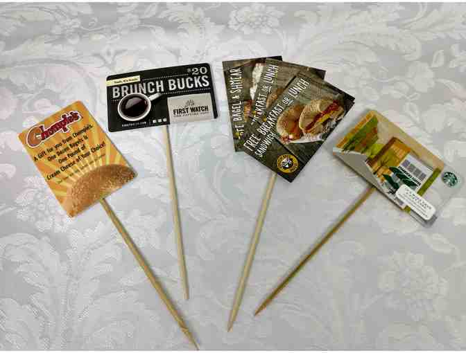 Einstein Bros Bagel w/Cream Cheese Cards & Sandwich Cards (2 ea - exp 12/31/19), Starbucks $25 Gift Card, Chompies Dozen Bagels w/Cream Cheese gift card (exp 10/31/20), First Watch $20 Gift Card