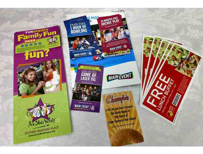 Chompies Dozen Bagels w/Cream Cheese gift card (exp 10/31/20), As You Wish Pottery Painting Studio Fees (5), Main Event Family Fun Pack, AMEX $50 Gift Card, Peter Piper Pizza Lunch Buffets (5 - exp 12/31/19 )