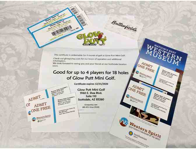 Glow Putt Mini Golf for 4 (exp 12/31/20), Odysea Aquarium for 2 (exp 9/3/20), Western Spirit - Scottsdale's Museum of the West for 4 (exp 10/31/20), Butterfield's Pancake House $25 Gift Card