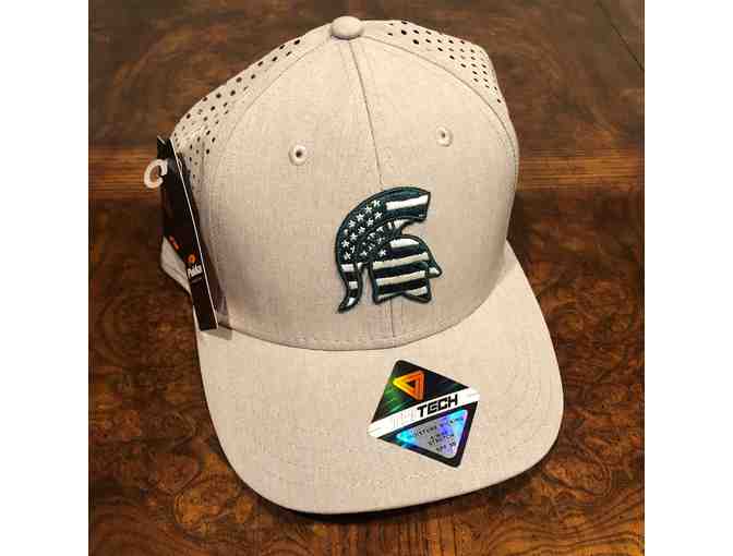 American flag green and white spartan emblem on a gray TriTech hat.