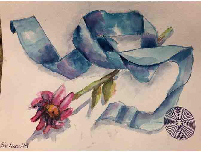 Watercolor painting of life as a ribbon with a labyrinth. Measures 9" x 13"