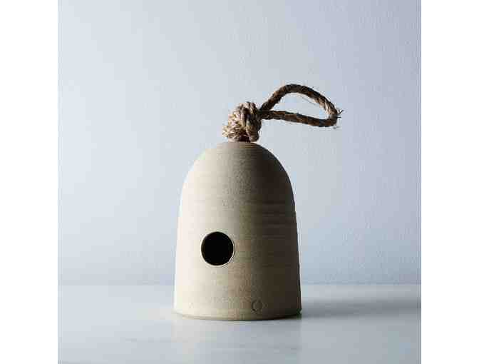 Inspired in shape by a beehive, this stoneware birdhouse blends in with the natural surroundings and provides a respite for all the feathered friends that flit around your yard. The birdhouse comes with an attached rope loop that can easily hang from an s-hook or a thin tree branch.