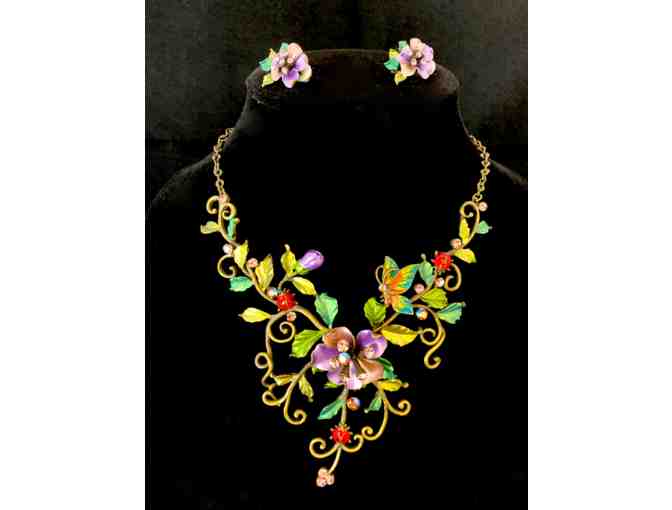 This stunning and intricate set includes am ornate floral necklace measuring 18 inches. The decorative piece measures 6.5 inches across and approximately 4 inches down. Comes with a matching set of clip-on earrings. Comes ready-to-gift in a black jewelry box.