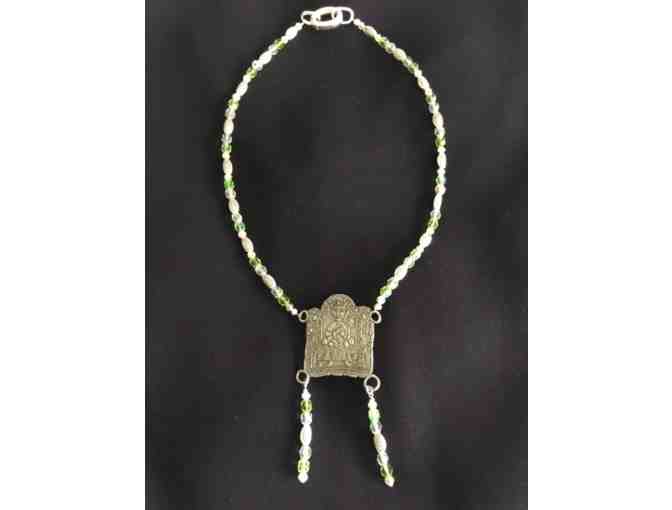 Replica of a Chartres pilgrim badge attached to 20" necklace of pale green crystal and glass beads with silver oval spiral spacers and silver clasp.