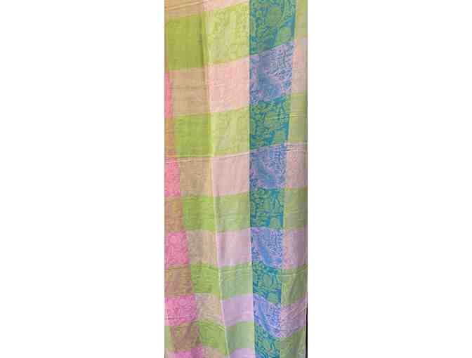 Wrap yourself in cozy pastels this season. Featuring subtle paisley and floral designs running through pastel blocks of pink, green and blue. Rayon material finished with fringe at both ends.