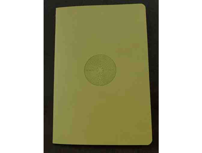 Size: 8" x 5" with a 2" labyrinth embossed on the front. Soft olive green color.
