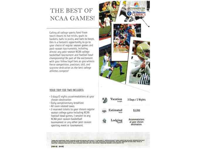 Best of NCAA Games for Two - 3 days/2 nights accommodations at your chosen destination, daily complimentary breakfast, all room related taxes, AND two reserved tickets to your chosen regular season college game including NCAA football bowl games, 1 session to any NCAA pos-season basketball tournament or any other post-season sporting event or tournament.