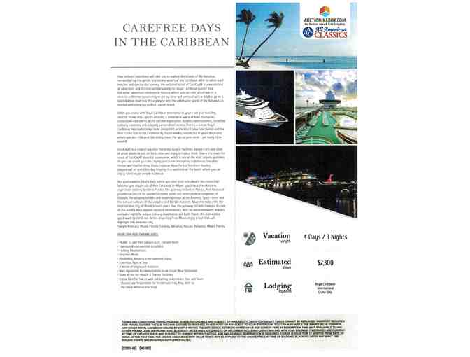Terms and Conditions: Travel package is non-refundable and subject to availability. Certificate/Gift Cards cannot be repaced. Passport required for travel outside the U.S. You may choose to pay a fee to add a 3rd or 4th guest to you stateroom. You can also apply the award value towards any other Royal Caribbean Cruise by simply paying the difference between award value and lowest fare at redemption time (not applicable to any other promo code or pomotion). Blackout dates are last 2 weeks of December including Christmas and New Year sailing. Itineraries are current at the time of cataglo issue and submit to change without notice. A 30 day advance reservation is required. Cruise is valid for 12 months from date of issue. After that time, the cruise has a monetary value which may be applied to the cruise price at the time of booking. Blackout dates may appl and Holiday travel may require a supplemental fee.