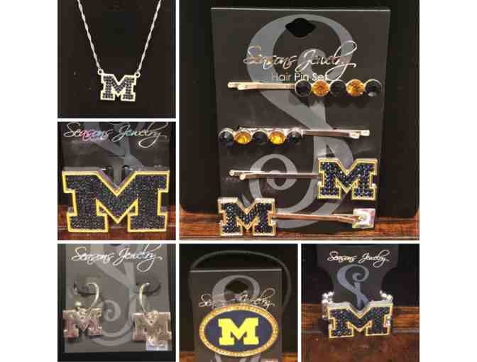 Winner of this University of Michigan jewelry packages receives a licensed necklace, hairpins, hairtie, pin, ring, and earrings.
