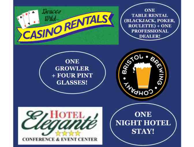 Plan your next party with the Casino Party package! Includes a casino night for 12 People from Dueces Wild, a growler and 4 pint glasses from Bristol Brewing Company, and a free overnight stay in a standard local hotel room. The hotel room will be perfect for an out-of-town guest!