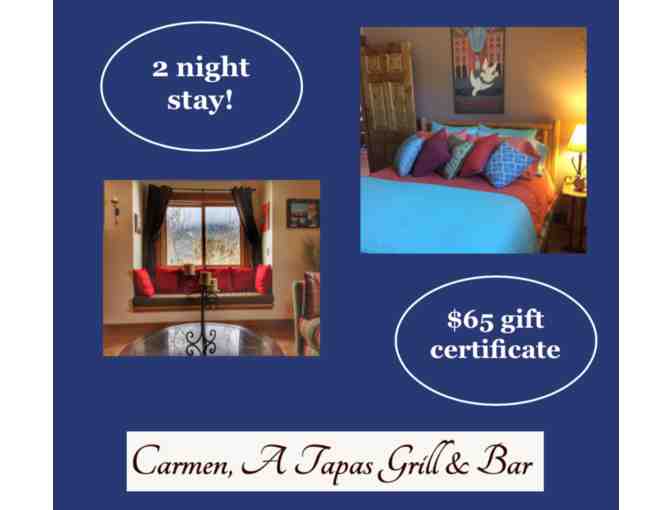 Enjoy a weekend away from the city with this package from Deer Crossing Guest House in Cascade, CO, and Carmen: A Tapas Grill & Bar. The package includes a 2-night stay at the Deer Crossing Guest House and $65 in gift certificates to Carmen Tapas Grill & Bar.