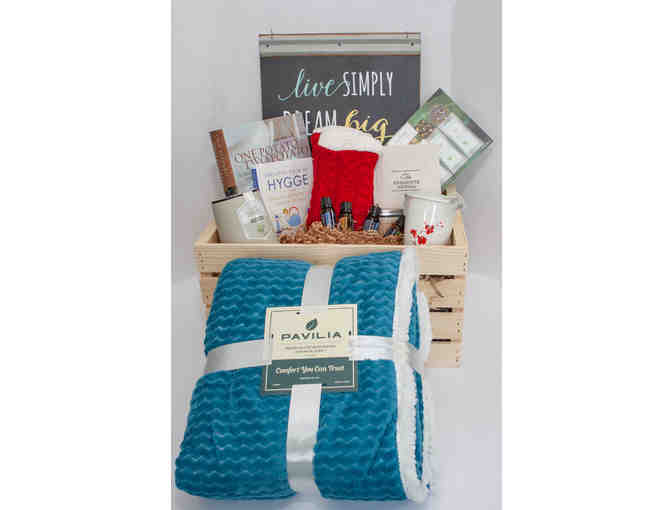 Hygge is the danish art of creating a cozy and comfortable space. Join this popular trend and win this basket designed to add some cozy to your life! This basket includes a wooden crate, Live Simply sign, fuzzy socks, cozy blanket, mulled cider candle, The Little Book of Hygge, 5-minute gratitude journal, 2 mugs, an assortment of teas, tree growing kit, essential oils, and a cookbook.