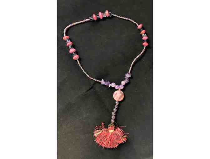 Hand crafted Labyrinth Prayer Beads made out of an assortment of semi-precious stones and beads with home made booklet of contemplative quotes. Comes wrapped in a clear lavender colored pouch. Envlope contains Celtic verse for protection and diagram of how the beads map to the labyrinth. Gifted to Veriditas.