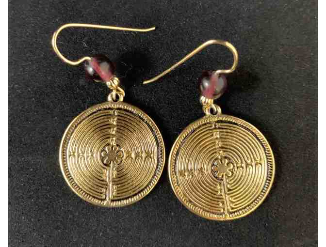 Gold dipped pewter labyrinth earrings with purple beads. Made especially for Veriditas. The last in stock!