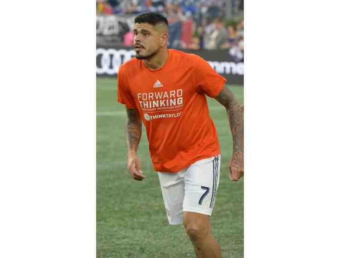 You are bidding on a Concussion Awareness Night training top worn and autographed by Gustavo Bou. This orange top features the logos of both Forward Thinking and ThinkTaylor, which is symbolic of the partnership between the Revolution and ThinkTaylor.