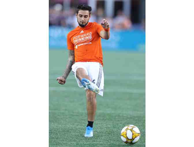 You are bidding on a Concussion Awareness Night training top worn and autographed by Diego Fagundez. This orange top features the logos of both Forward Thinking and ThinkTaylor, which is symbolic of the partnership between the Revolution and ThinkTaylor.