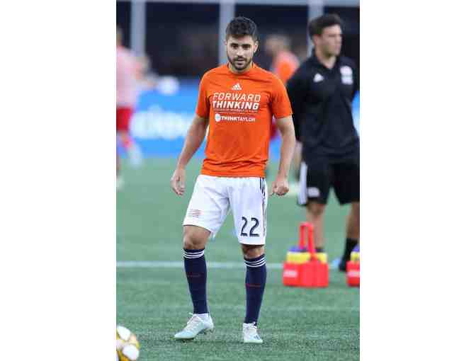You are bidding on a Concussion Awareness Night training top worn and autographed by Carles Gil. This orange top features the logos of both Forward Thinking and ThinkTaylor, which is symbolic of the partnership between the Revolution and ThinkTaylor.