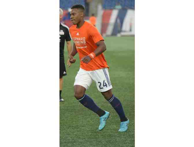 You are bidding on a Concussion Awareness Night training top worn and autographed by DeJuan Jones. This orange top features the logos of both Forward Thinking and ThinkTaylor, which is symbolic of the partnership between the Revolution and ThinkTaylor.