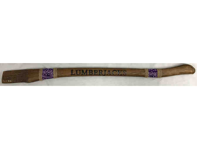 Bid to win this customized stained wood burned axe handle with Lumberjacks burned into the wood.