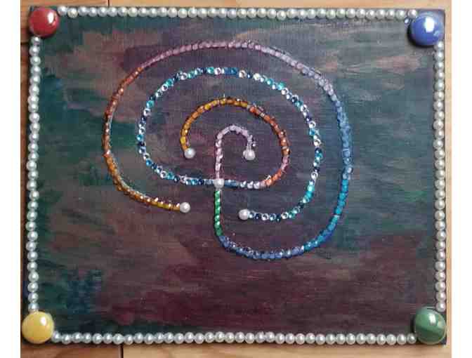 Functional art for use as a meditation tool. Background painted on canvas and labyrinth path and framing decor added as top layer.