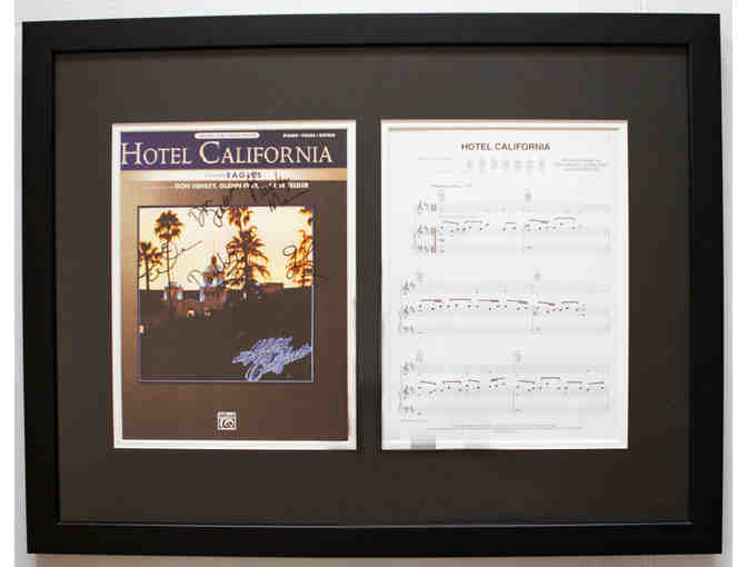 This item includes one framed copy of the sheet music from the song Hotel California, signed by the members of the Eagles.