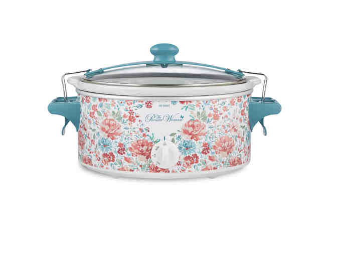 The stylish Pioneer Woman Gorgeous Garden 6 Quart Portable Slow Cooker is ideal for cooking and carrying food to potlucks and parties. It has comfort-grip handles and clips that cleverly hold the lid in place while traveling to avoid spills. It has 3 heat settings: high low and warm. The slow cooker's large 6 quart capacity and oval shape are ideal for handling large cuts of meat. It will cook a 6 lb. chicken or a 4 lb. roast and serves 7+ people. The stoneware insert and glass lid easily remove for serving food on the table or for cleaning. Just place them in the dishwasher for easy cleanup.