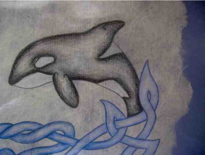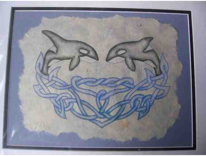 This lovely depiction of a male and female orca bowing to each other is loosely based on Celtic illuminated manuscripts. Original color pencil drawing on hand-made paper, 12" x 9", mounted on archival acid-free mat board and matted to 16" x 12".