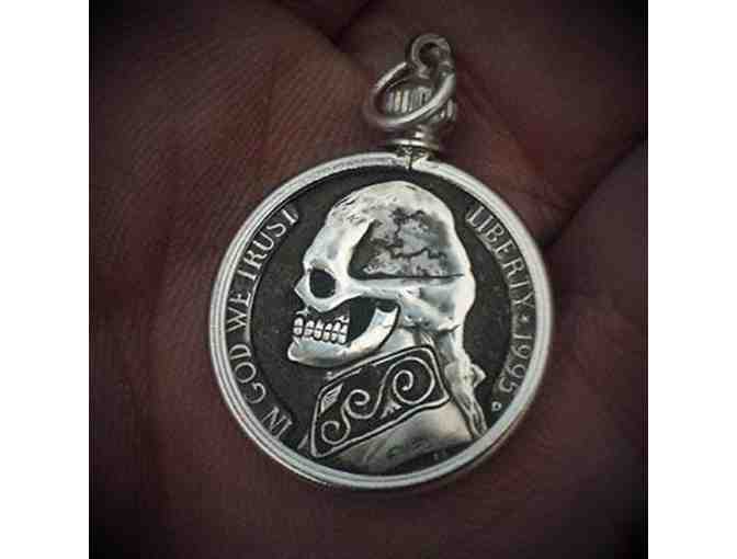 Collectible hand-carved “Hobo Nickel” by contemporary carver David “Coalburn” Raymond. 1995 Jefferson nickel, carved in 2018 with skull detail and raised scroll work, set in a nickel-plated pendant holder. Unsigned (as traditional), reverse is uncarved Monticello.