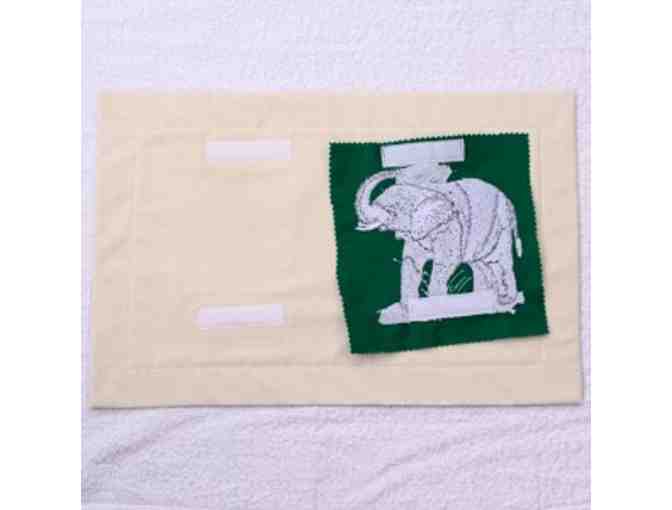 * The bathing elephant is embroidered onto green felt and is attached with two velcro fasteners at the top and bottom.