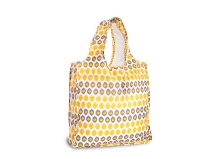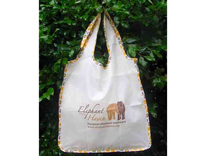 1) ONE-OF-A-KIND reuseable tote, featuring the Elephant Haven European Elephant Sanctuary Logo with coordinating gray/orange Ikat print. Light weight but strong, water-resistent polyester, machine washable. 15" x 15" x 4", rolls up with "velcro" ties for compact storage.