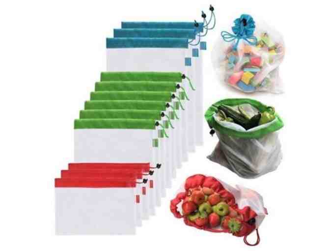 2) Net Zero reuseable produce bags replace single-use and are perfect for both shopping and storing fruits and vegetables, as well as other household uses. Set of 12 bags, machine washable, BPA-free, food-safe polyester mesh, with drawstring toggie closure. Includes 3 small bags (8"x11"), 6 medium (13"x11"), and 3 large (16"x11").