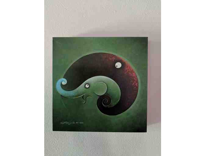 ALL EYES are on this engaging work by Lertsark Bangkaew, of LertMoree Art Studio in Chiang Mai, Thailand. A mother and her smiling calf embrace on a vivid green background, evoking their bond to each other and their natural habitat.