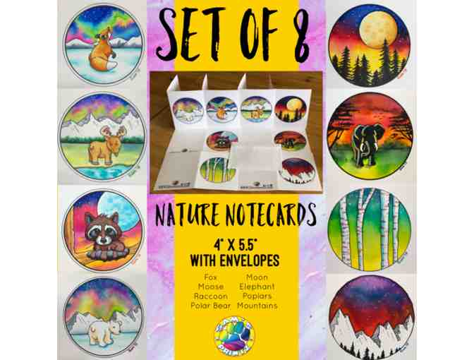 Beautiful set of 8 notecards from original watercolors by Sam's Printz (Canada). One each of fox, moose, raccoon, polar bear, rising moon, elephant, poplar grove and snowy mountains. 4" x 5.5", with envelopes