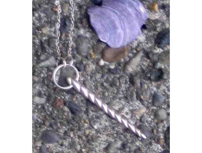This stunning "Circle of the Narwhal" pendant was made by DalaHorse Metal Arts in Ohio, using the lost wax casting method. The solid sterling "tusk", in a 360 degree spiral design, measures 1.75" in length and about 1/8" at widest section. Pendant hangs from an 18" sterling, small-link chain with secure lobster clasp.
