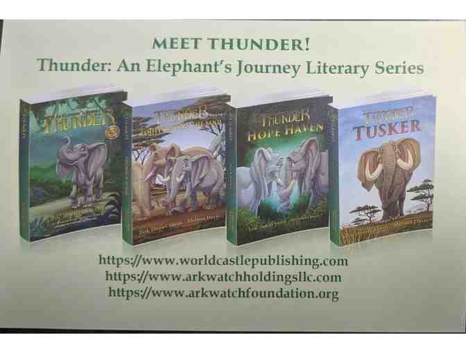 The award-winning first in a series of four beautifully written and illustrated books: "The tiny elephant’s life was pretty much perfect until one fateful night when poachers crept into it. In the cloak of darkness, they sprang on his herd separating him from his mother and the rest of the African pygmy herd. After a harrowing escape, Thunder must dig deep inside to find the courage to find his way home. With helpful friends and the watchful eye of the Great Tusker in the sky, Thunder’s journey is the adventure of a lifetime."
