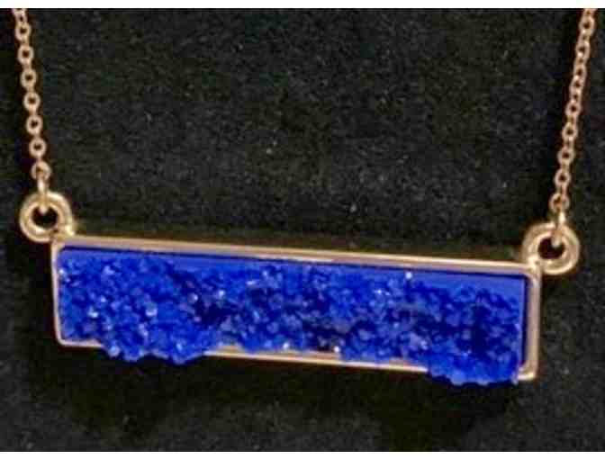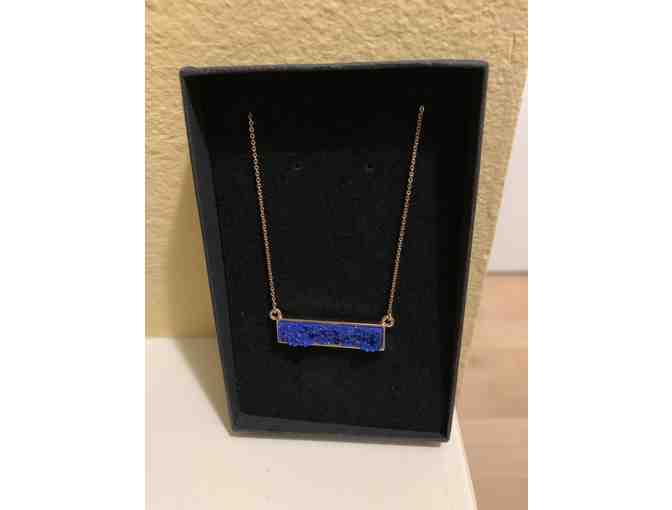 This pretty gold tone and cobalt blue stone bar necklace is both natural and refined, petite but powerful! Making it versatile for both casual and evening wear. Bar is approx 1.5" x .5".