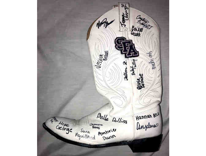These boots were worn by the SFA Dance Team in 2016 through today. They are signed by the 2019 Dance Team.