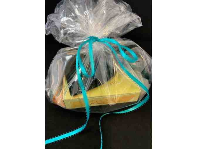 This lovely set of items includes a beautiful "Earth" scarf in fall tones, and a lovely matching shell pendant featuring spiral nautilus design in a green velvet pouch as well as a set of four handmade olive oil soaps.